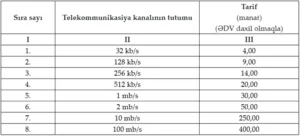 Demnach beträgt die Anschlussgebühr für innerstaatliche Telekommunikationskanäle unabhängig von der Bandbreite des Kanals 50 Manat inklusive Mehrwertsteuer. Die monatlichen Nutzungspreise sind im Anhang zur Entscheidung festgelegt.